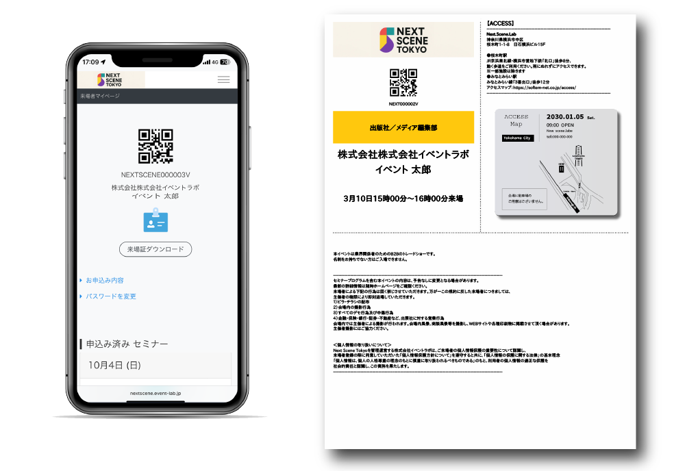 「来場者分類による色分け表示」や「会場マップデータの貼り付け」、「イベントの注意事項の記載」ができる来場証の発行が可能です。